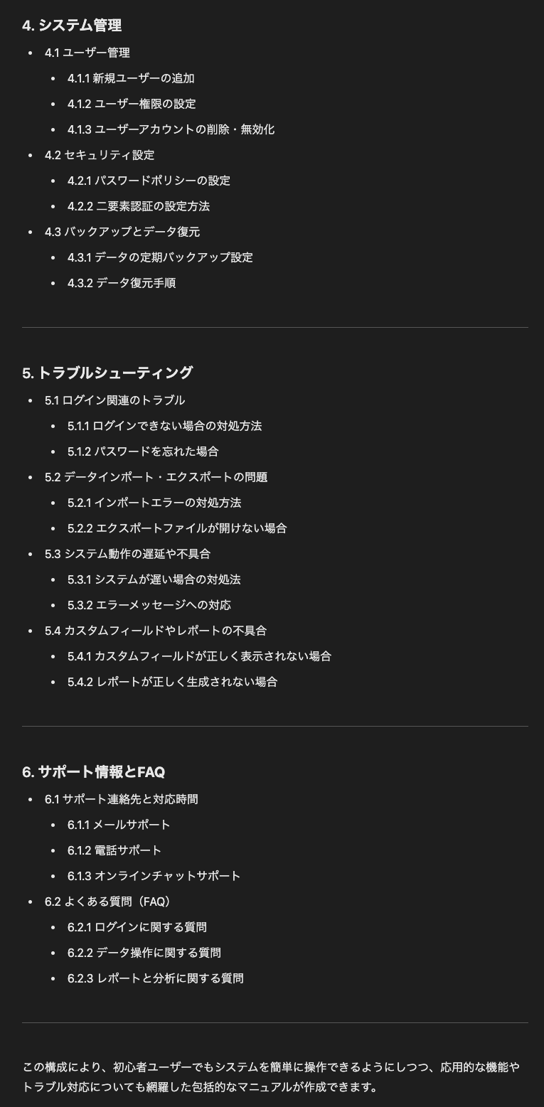 - マニュアルの構成に従って生成させるためのプロンプトを考える