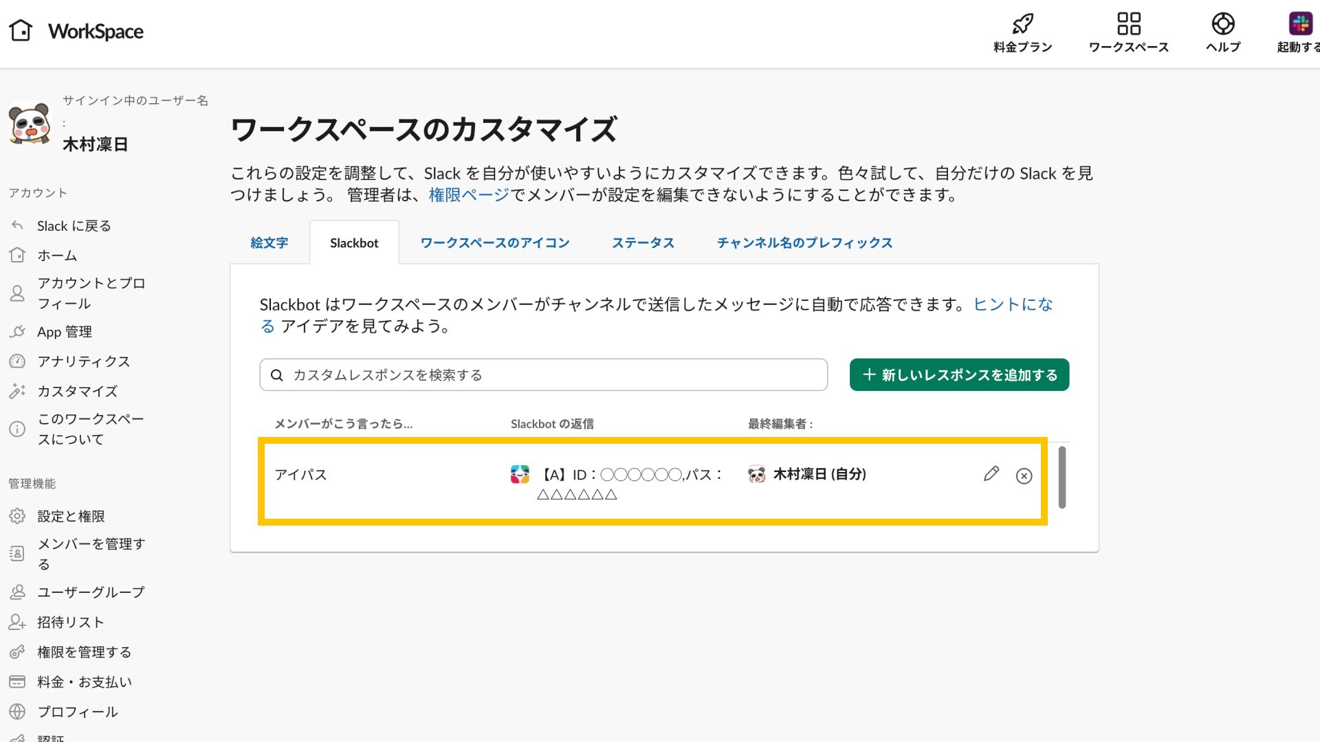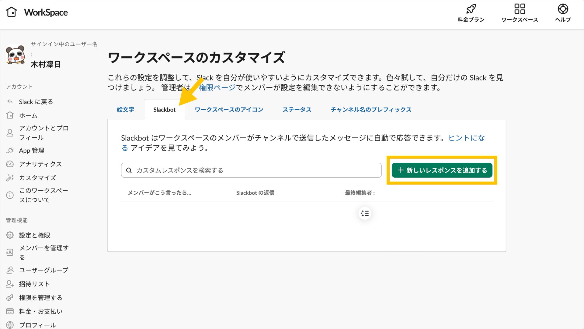 - WorkSpace「Slackbot」タブから「新しいレスポンスを追加」をクリック