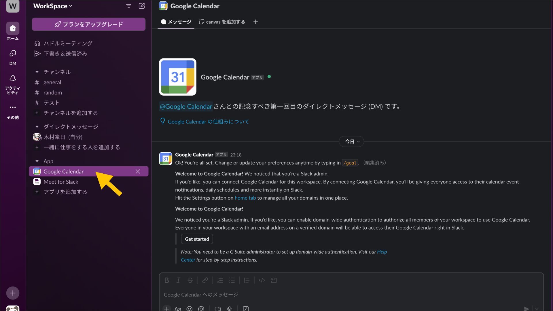 反対に、Slackで入力した予定をGoogleカレンダーに追加(同期)することも可能です。