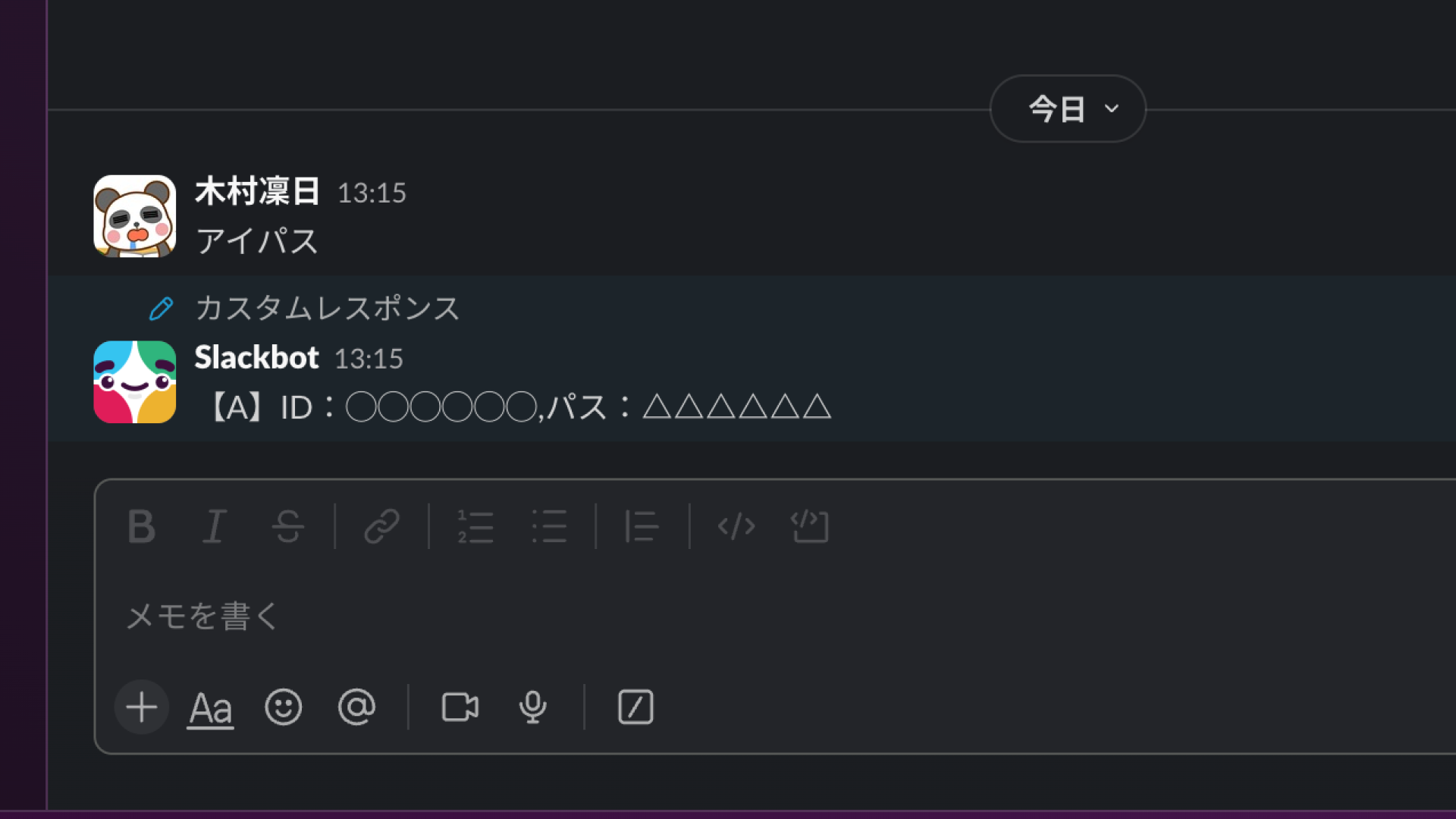 Slackbotを使う手順は以下のとおりです。今回は「ID・パスワード」を教えてくれるよう設定したシーンを例とします。