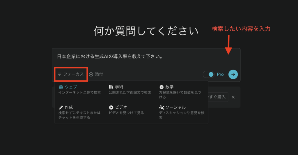 Perplexityにはフォーカスモードという機能があり、検索範囲を特定の分野やテーマに絞り込むことができます。