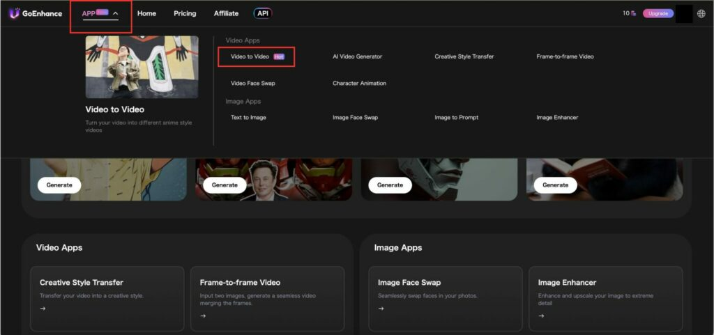 GoEnhance AIは、実写動画をアニメスタイルに変換できるだけでなく、画像生成やビデオフェイススワップなど多様な機能が搭載されている動画/画像生成AIツールです。