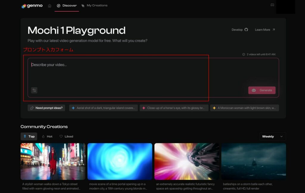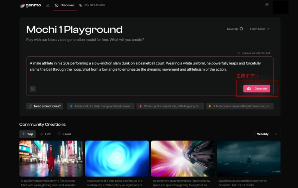 プロンプトが思い浮かばない時は、「Need prompt ideas?」ボタンを押すと、Mochi 1がランダムでプロンプトを入力してくれます。