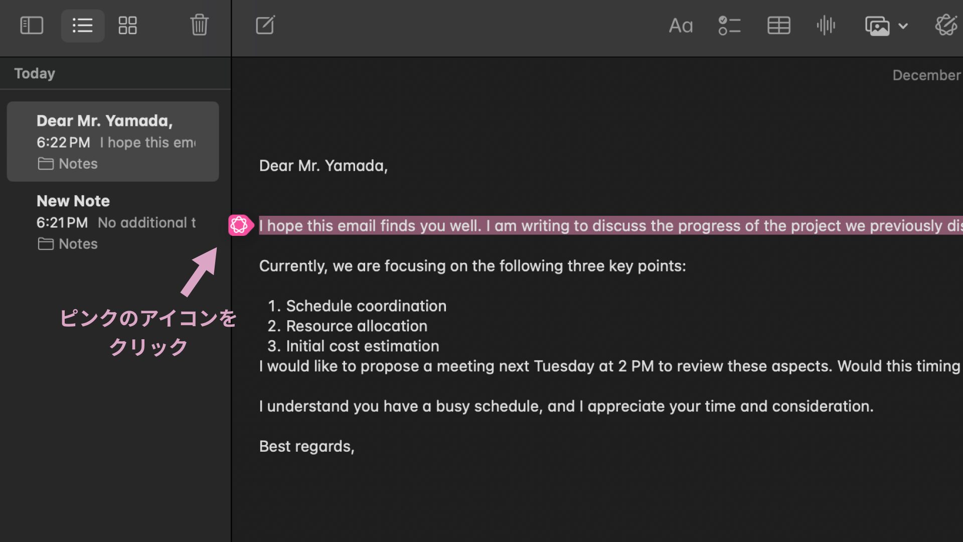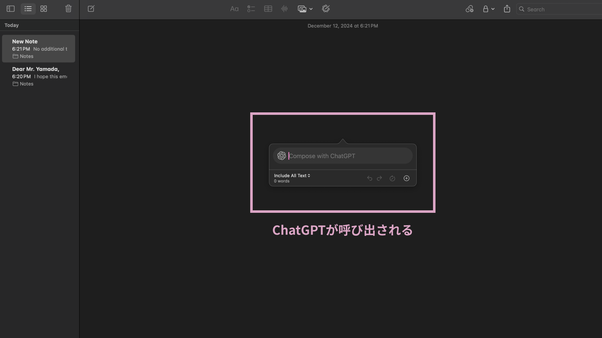 今回はApple内のメモ機能を用いて、Writing ToolsでChatGPTを使う手順を解説します。手順は以下のとおりです。