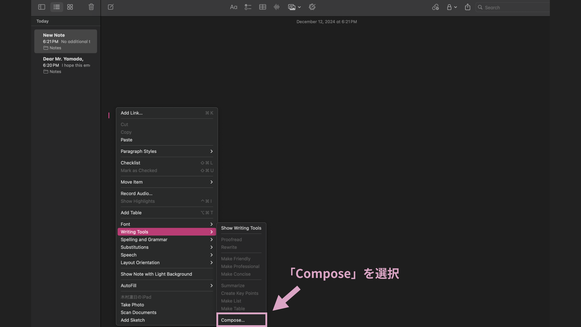 まずは使用するツールの画面で右クリックをしましょう(手順1)。右クリックするとさまざまな機能が表示されますので、「Writing Tools」から、下部にある「Compose」を選択しましょう(手順2)。