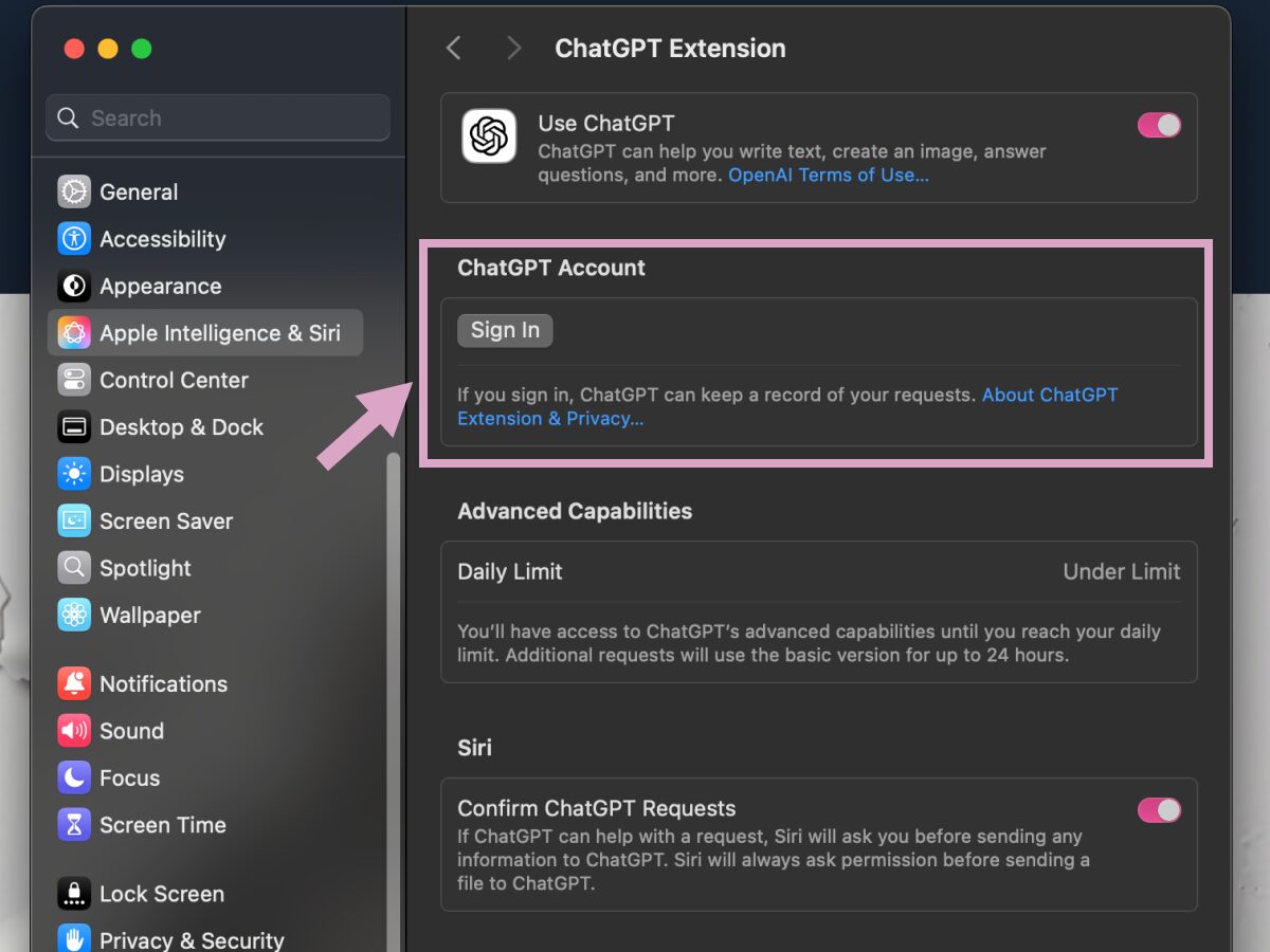 アカウントを連携する場合は、デバイスの設定画面「Apple Intelligence & Siri」よりサインインを行ってください。