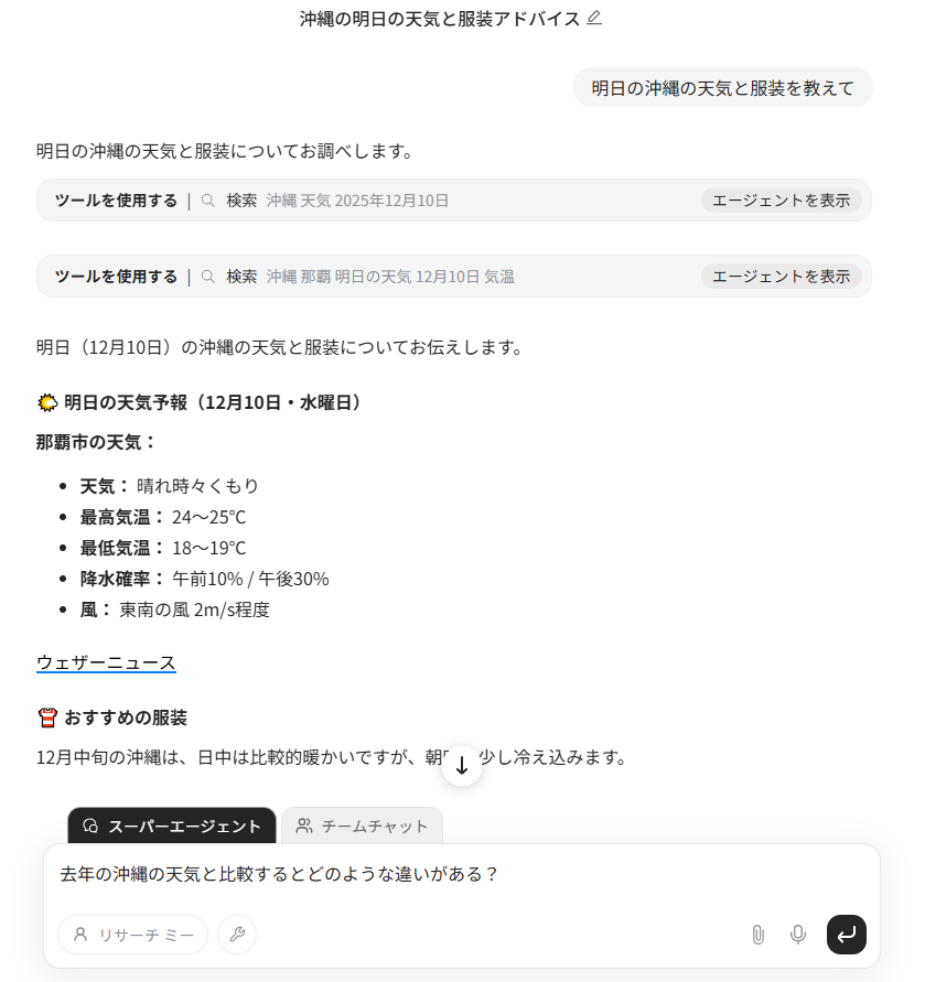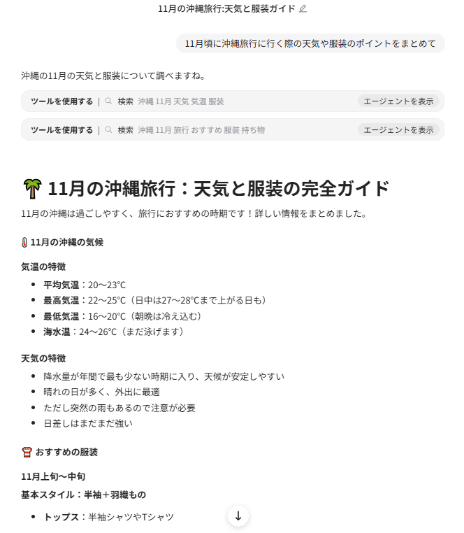 今回実際に、「11月頃に沖縄旅行に行く際の天気や服装のポイントをまとめて」と指示しました。