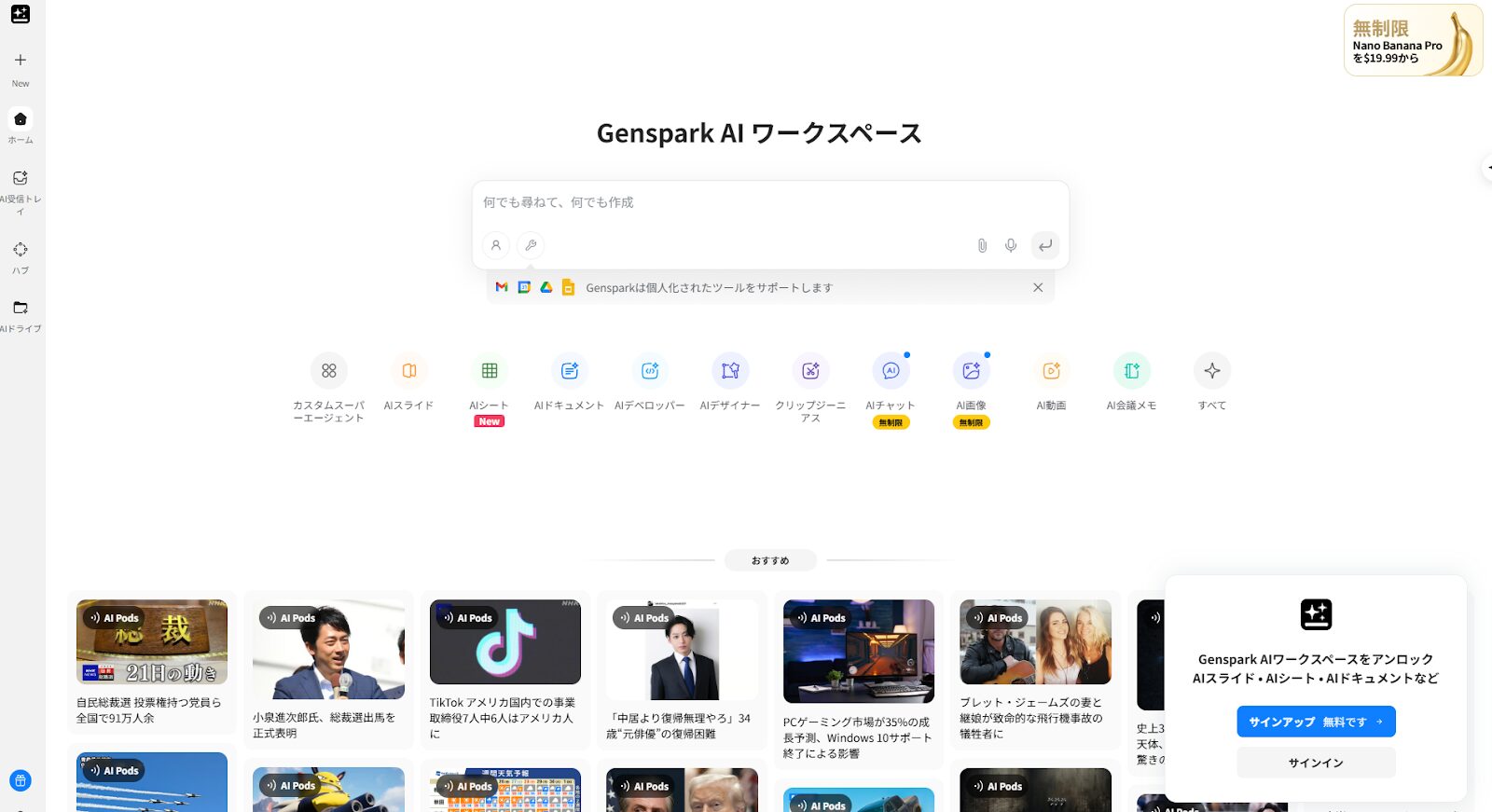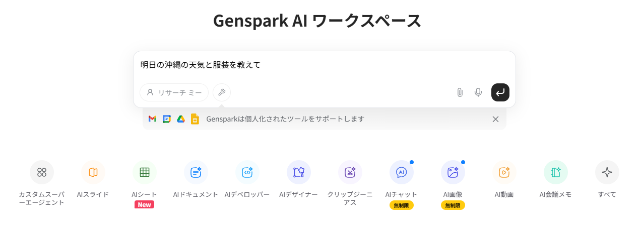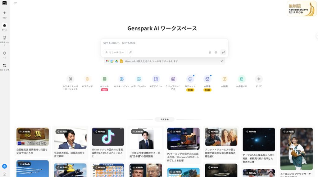 Genspark機能が多いため、登録しておけばさまざまな業務に応用でき、業務効率化にもつながります。では、1つずつ機能を確認していきましょう。