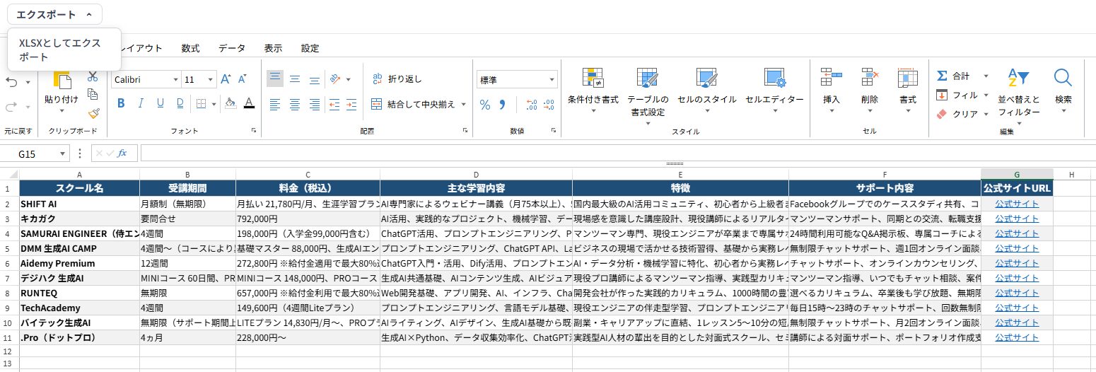 さらに「各AIスクールの公式サイトのリンク先を追加して」と指示したところ、URLが追加され、気になったスクールのサイトにもすぐにアクセスしやすくなっています。