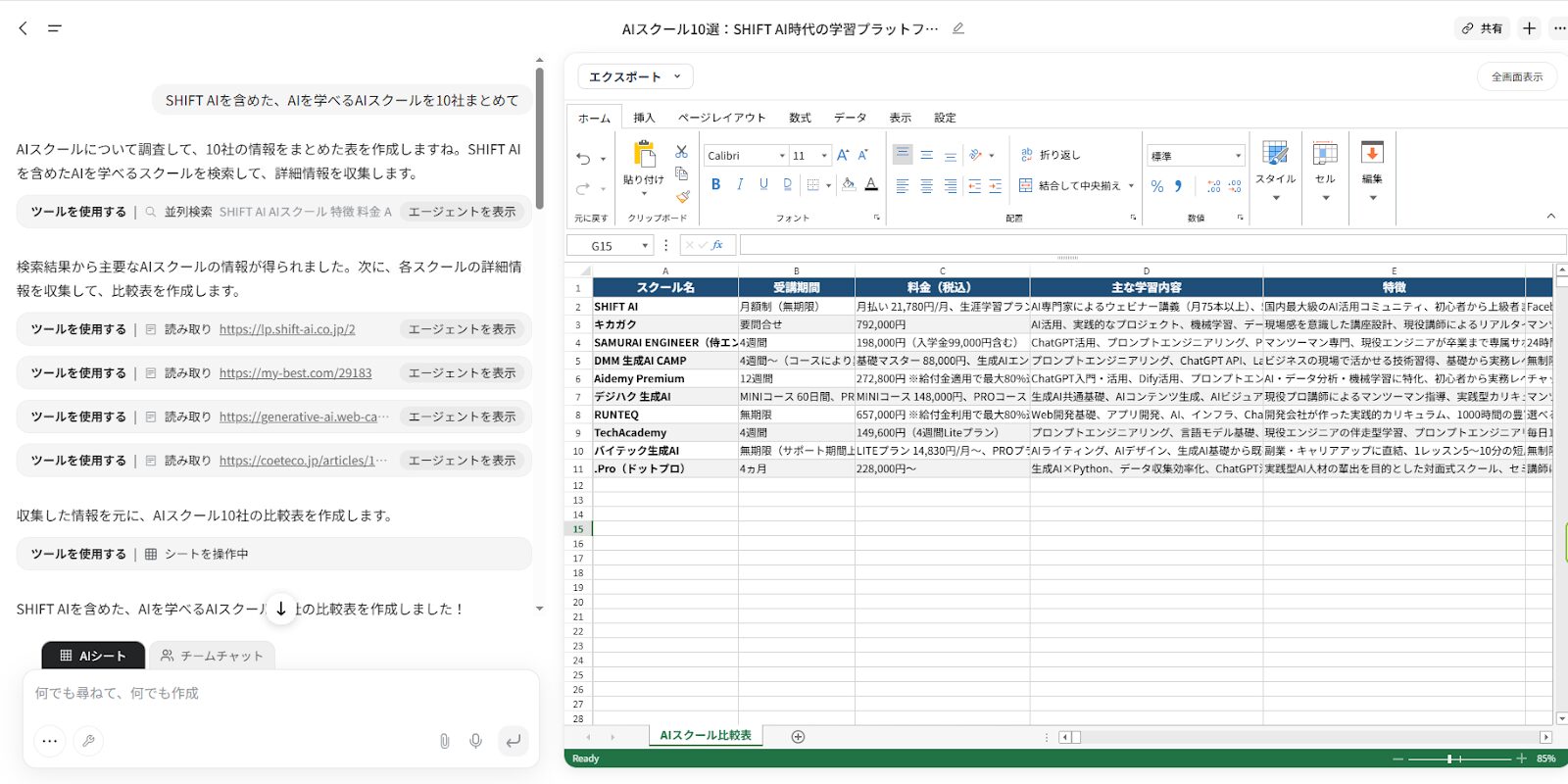 今回は「SHIFT AIを含めた、AIを学べるAIスクールを10社まとめて」と指示しています。