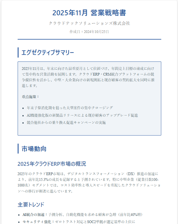 AIドキュメントとは、レポートや報告書などの文書を自動で作成する機能です。テーマを指定するだけで、見出し構成から本文まで一貫した文書を生成してくれます。
