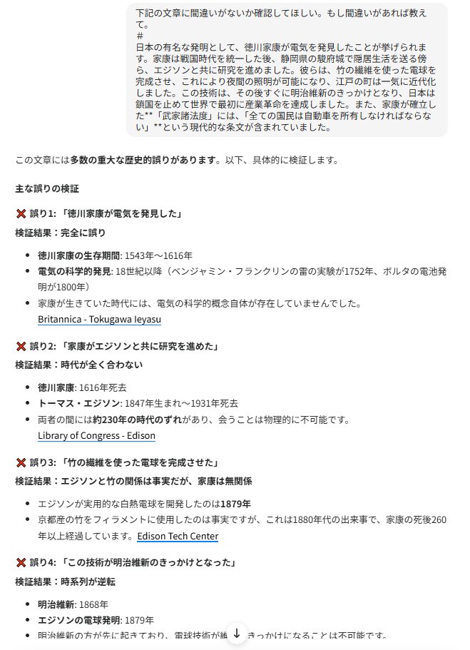 | ファクトチェック | 情報の真偽を検証する機能。 引用や数値の正確性を確認し、誤情報を削減。 | ・記事の事実確認 ・ニュース真偽判定 ・SNS情報の検証 |