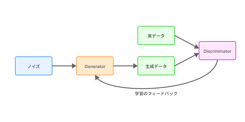 生成器はノイズから偽物を作り、識別器はそれを本物かどうか判定します。両者が互いに対抗する過程を通じて、より自然で精巧な出力が得られます。