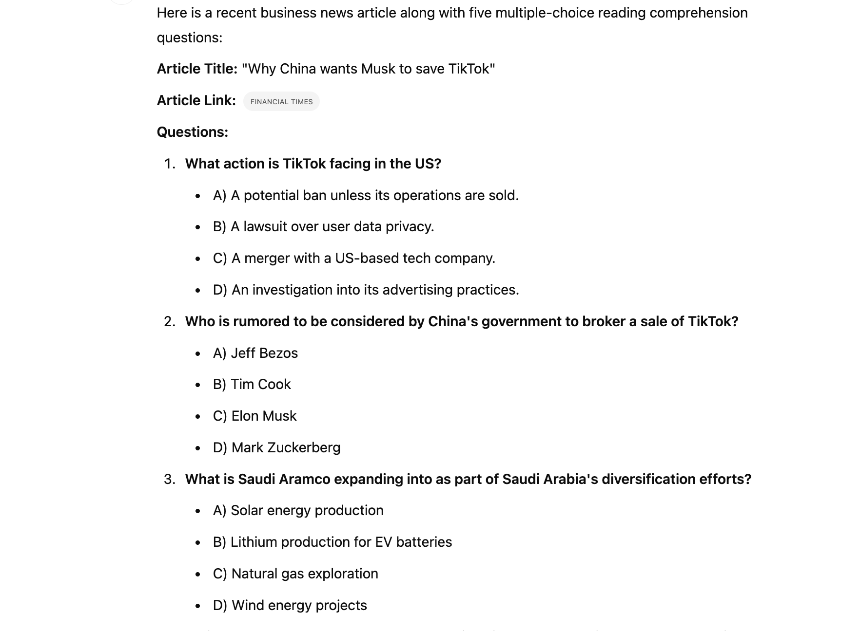 毎朝9時にビジネス関連の最新ニュースを取得して、英語の読解問題を作成してください。問題は、問題となる記事リンクを提供し、その記事から選択式の問題を5問用意すること。