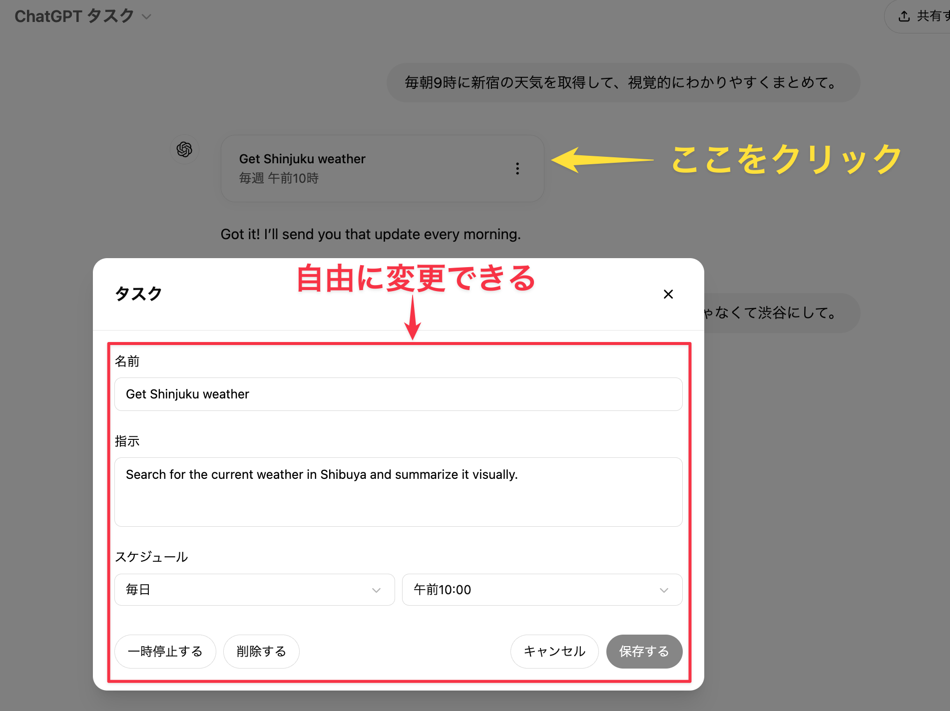 このように、タスク機能を使うことで、自分でChatGPTを開くことなく自動でタスクを実行できるようになります。