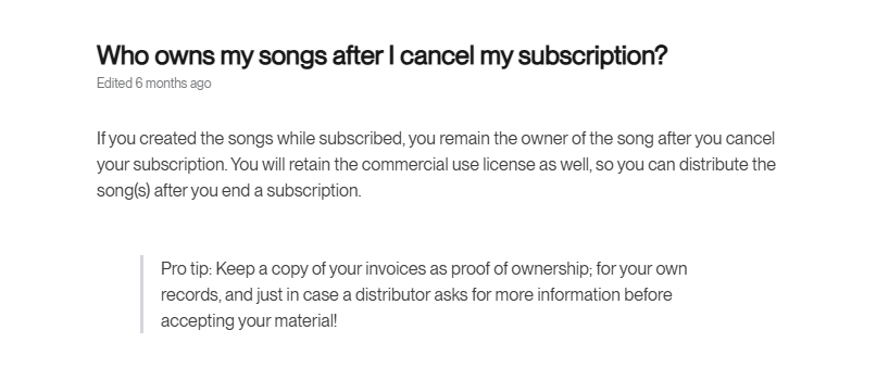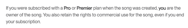 ProまたはPremierプランで楽曲が作成された場合、あなたがその楽曲の所有者となります。また、サブスクリプションを終了した後でも、その楽曲の商用利用権を保持し続けることが可能です。