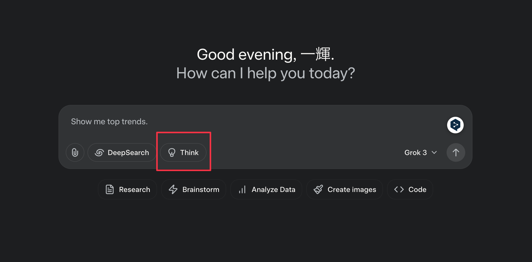 推論モードを使う場合は、「Think」ボタンをクリックします。