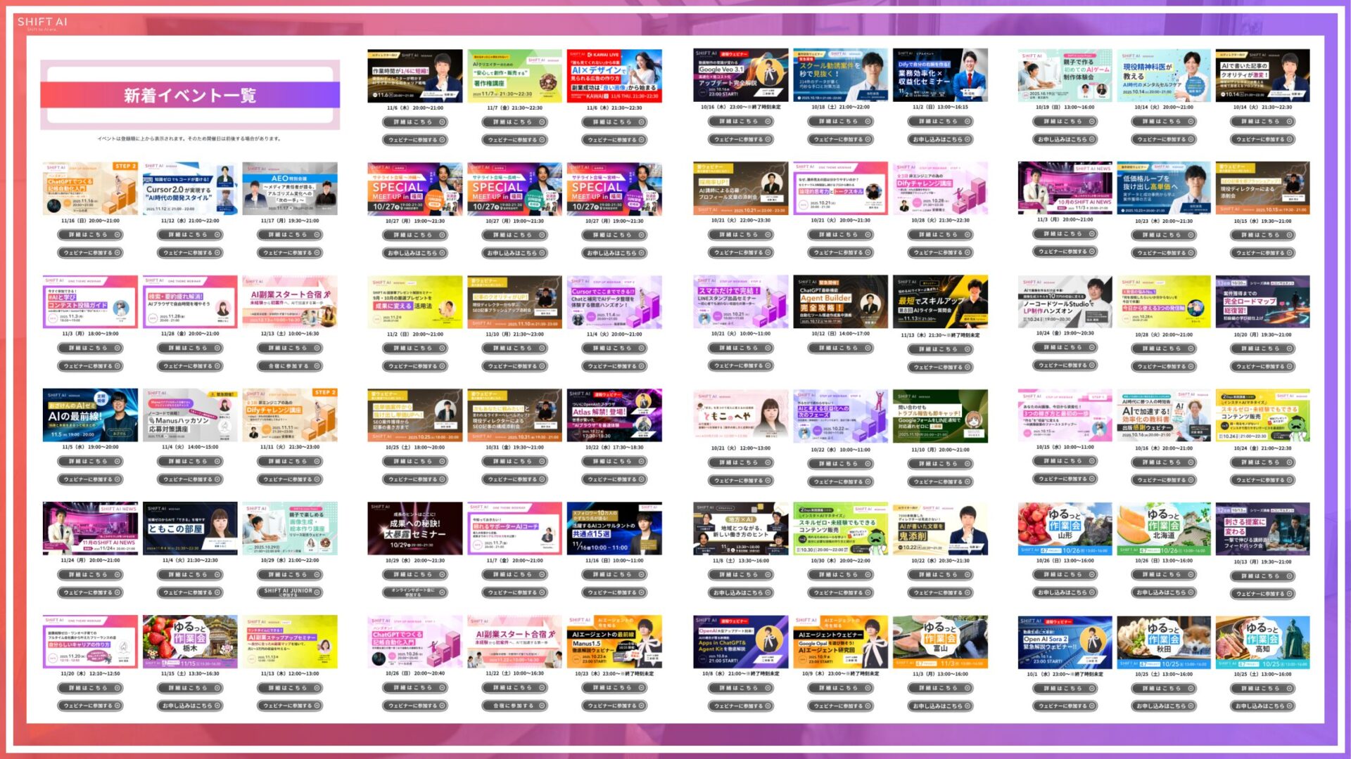 SHIFT AIでは、平日を中心にほぼ毎日ライブのオンラインウェビナーが開催されています。