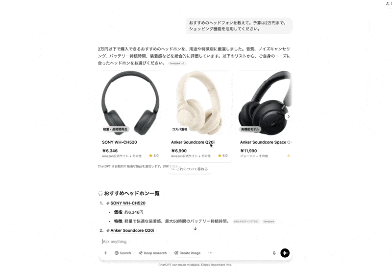 ChatGPTとの対話を通じてひとつずつ疑問点を解消していくことで、購入前の不安を取り除き、より深く納得した上で商品を選べるのもショッピング機能のメリットです。