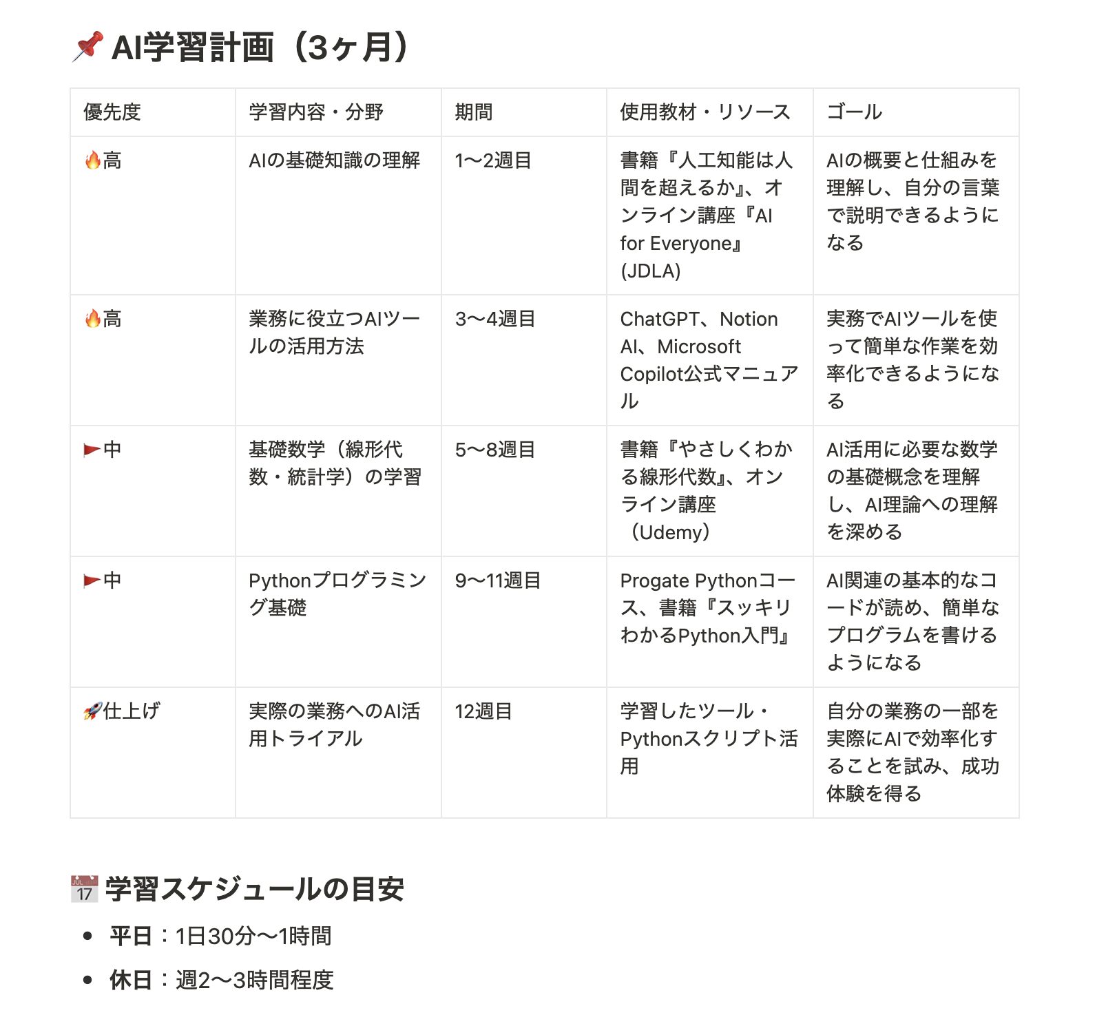 以下は、筆者が実際に作成したAIの学習計画です。