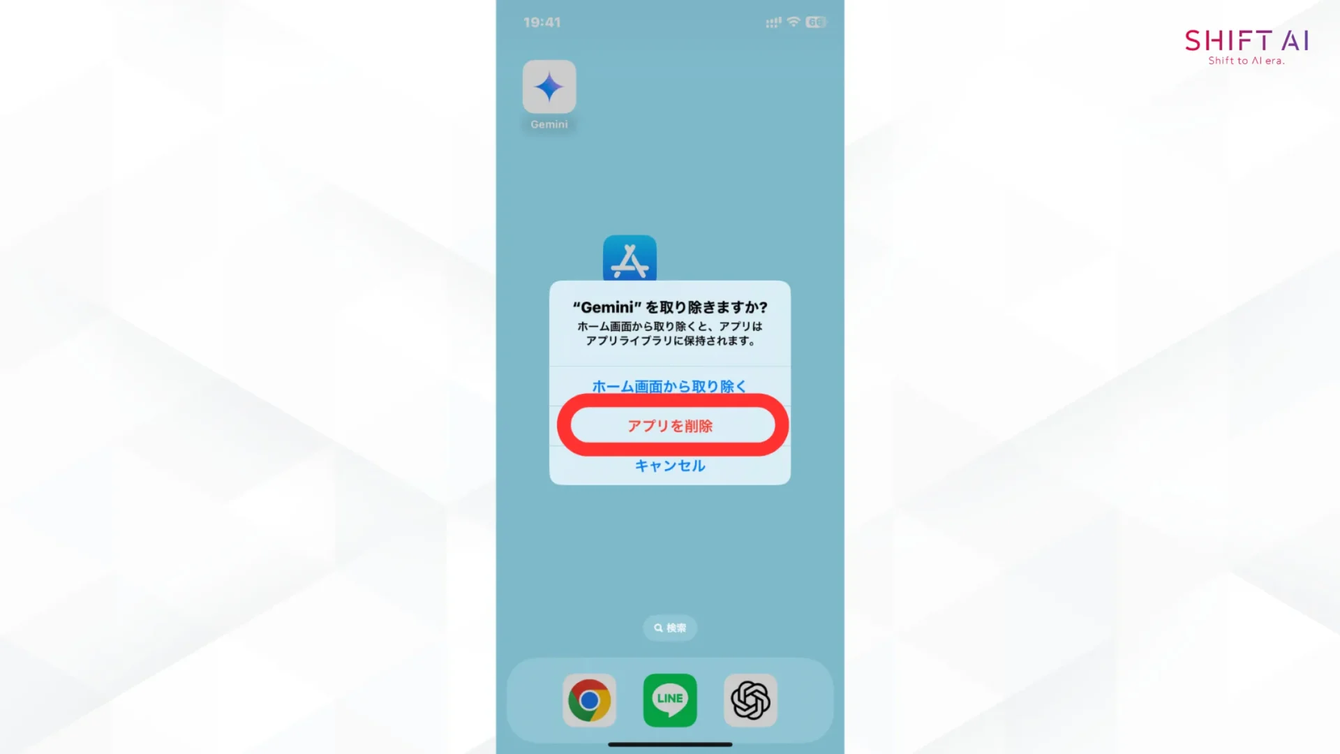 iPhoneには無効化機能がないため、Geminiアプリをアンインストールします。手順は以下の通りです。