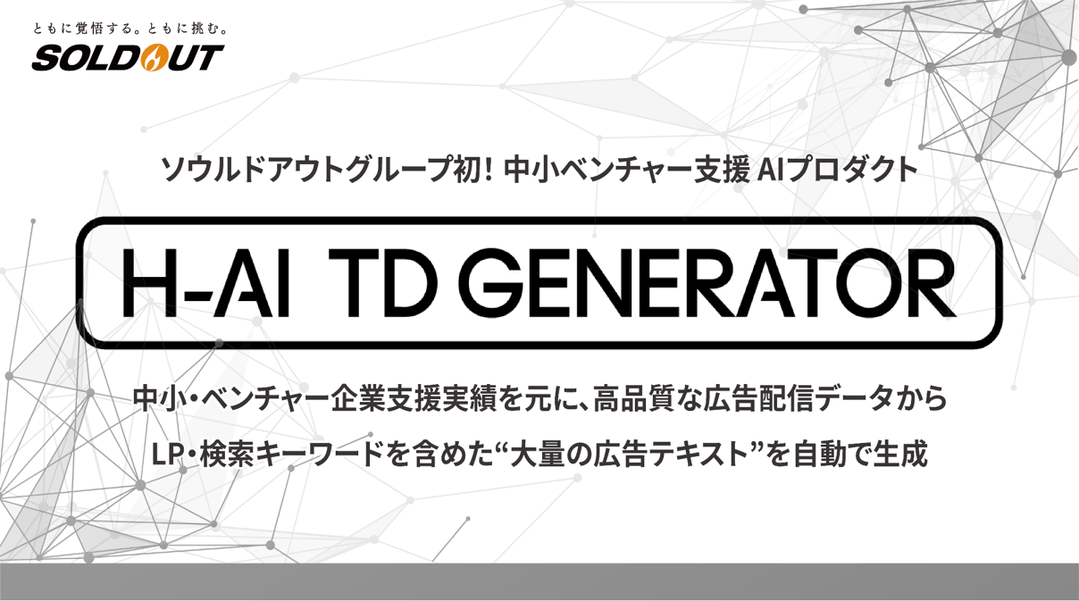 H-AI TD GENERATORは、ソウルドアウト株式会社が提供する広告成果支援プロダクトです。AIを用いて広告キャンペーンのデータを解析し、最適なクリエイティブや配信設定を自動で提案してくれます。