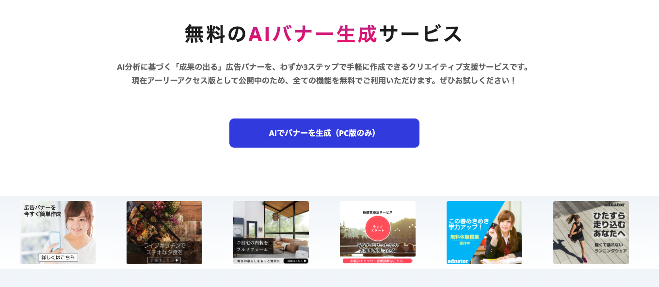 AIの知識がなくても短時間で効果的な広告バナーを作成できるため、初心者でも安心して使用できます。現在、アーリーアクセス版として全機能を無料で提供しており、ビジネスニーズに応じた有料プランも今後導入予定です。