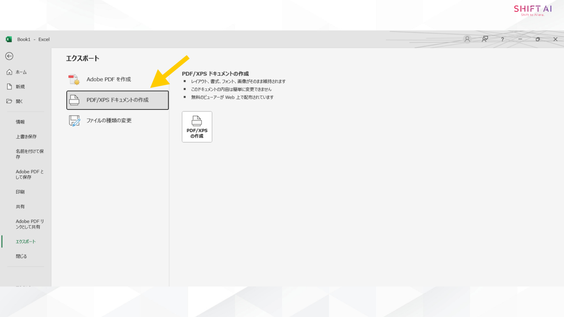 次にメニューから「エクスポート」を選択し、「PDF/XPSドキュメントの作成」を選択して保存します。