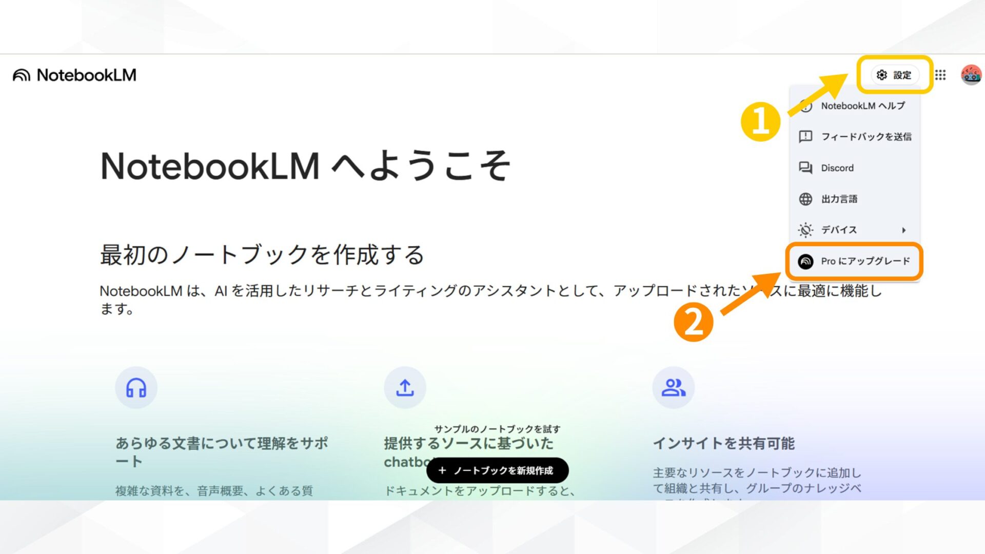 「Try NotebookLM」を選択後左上にある「設定」を選択し、表示されるメニューの中から「Proにアップグレード」を選びます。