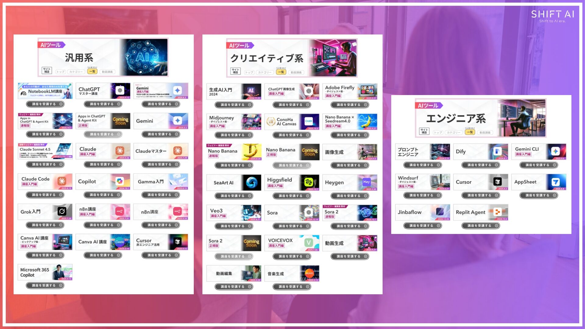 SHIFT AIでは、効率的にAIツールの選定と活用法を学べるため、時間の節約にもなるでしょう。