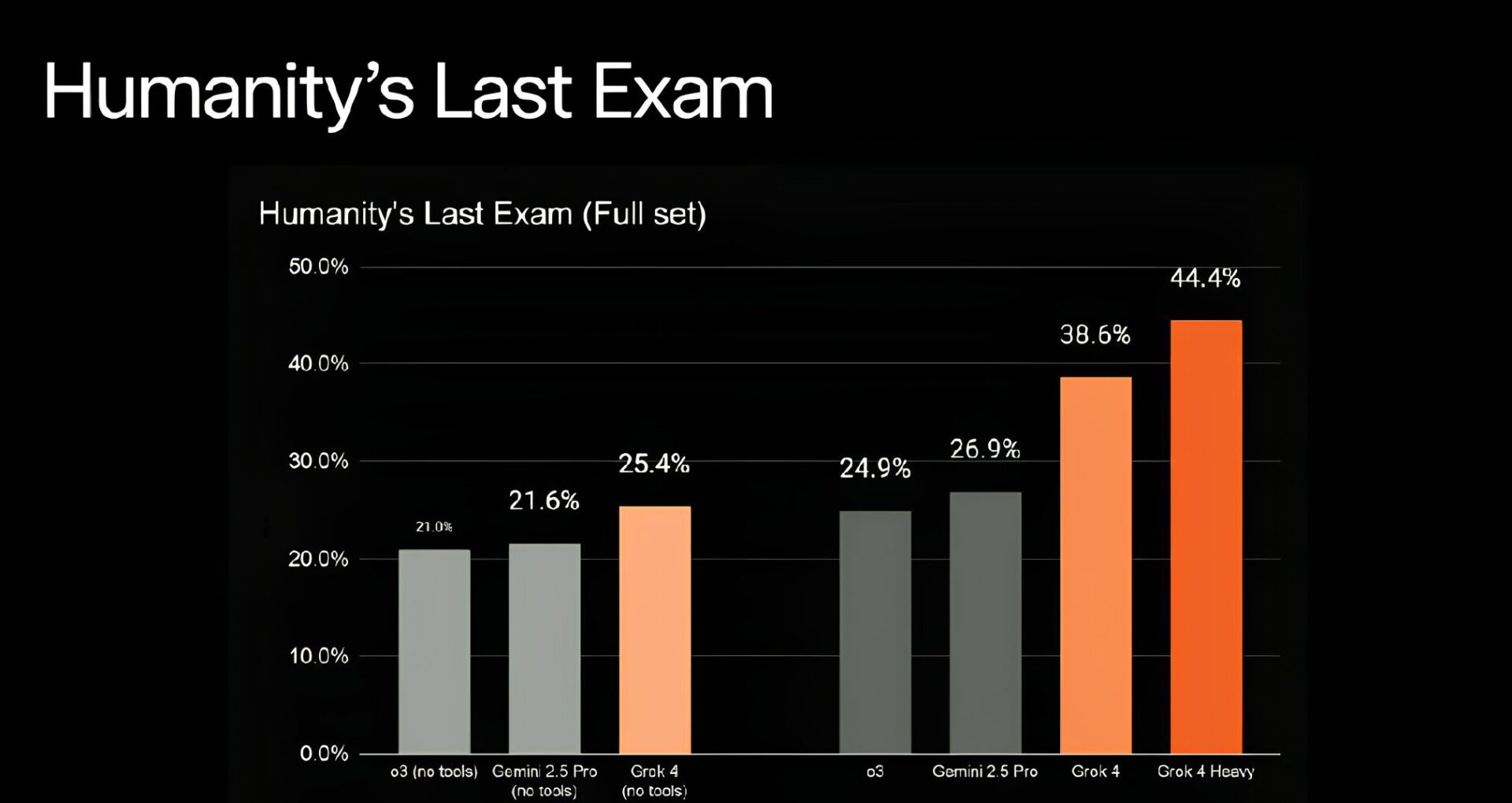 Grok 4は38.6%、Grok 4 Heavyは44.4%と、o3やGemini 2.5 Proなどのモデル(21〜27%)を大きく上回り、従来の生成AIでは解けなかった高度なタスクにも対応しています。