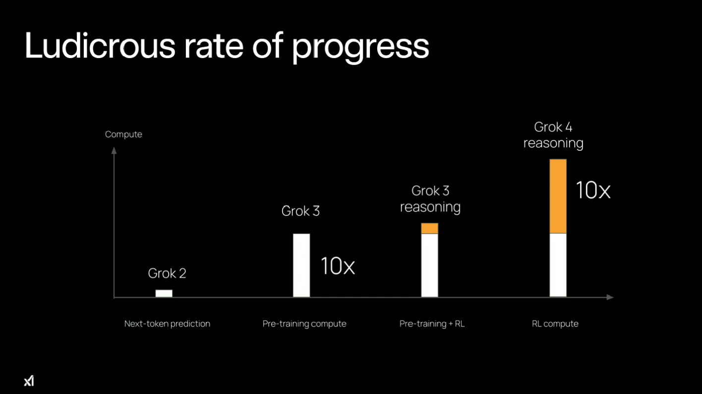 とくにGrok 4では、強化学習(オレンジ部分)に割り当てられた計算資源がGrok 3の10倍に増え、推論能力が飛躍的に向上しています。