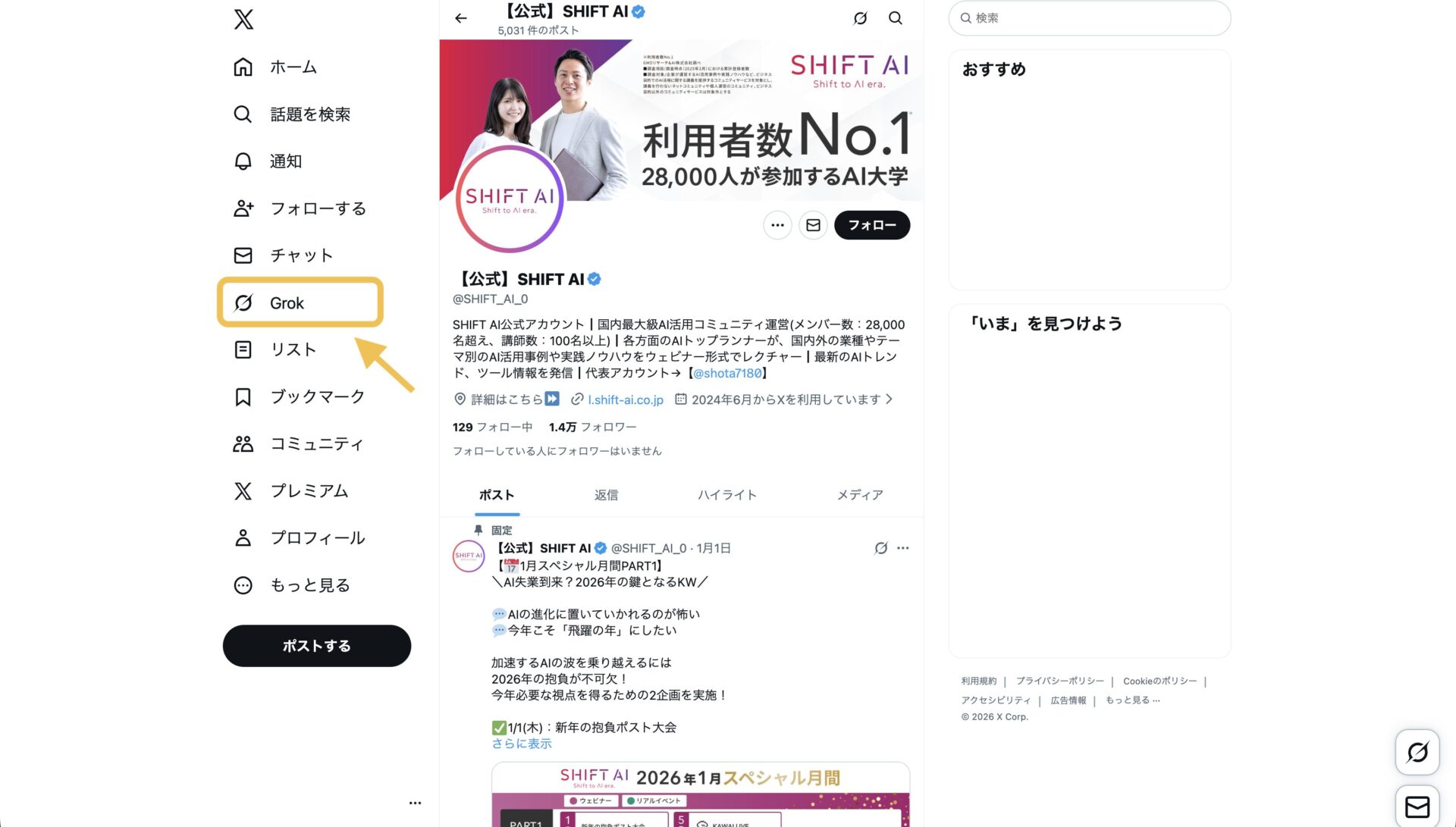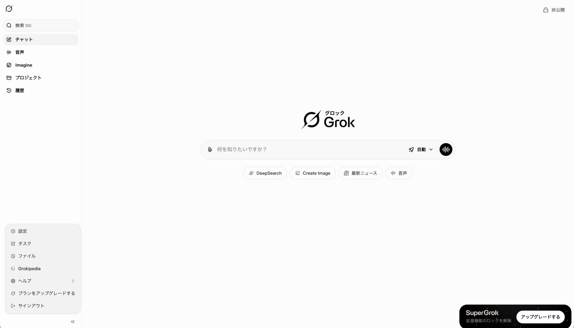 まずは左側のメニューから「Grok」を選択し、Grokを開きましょう。