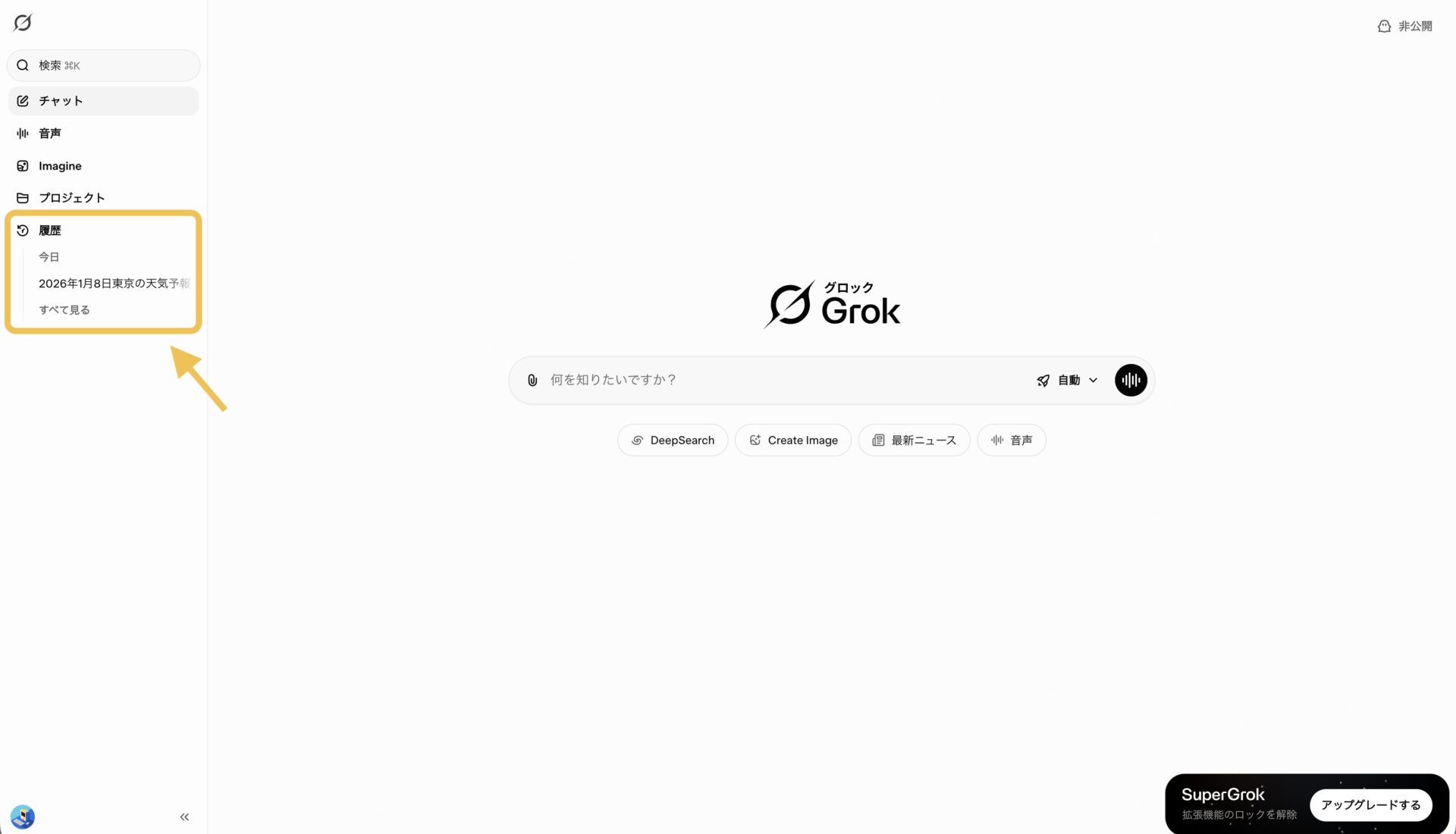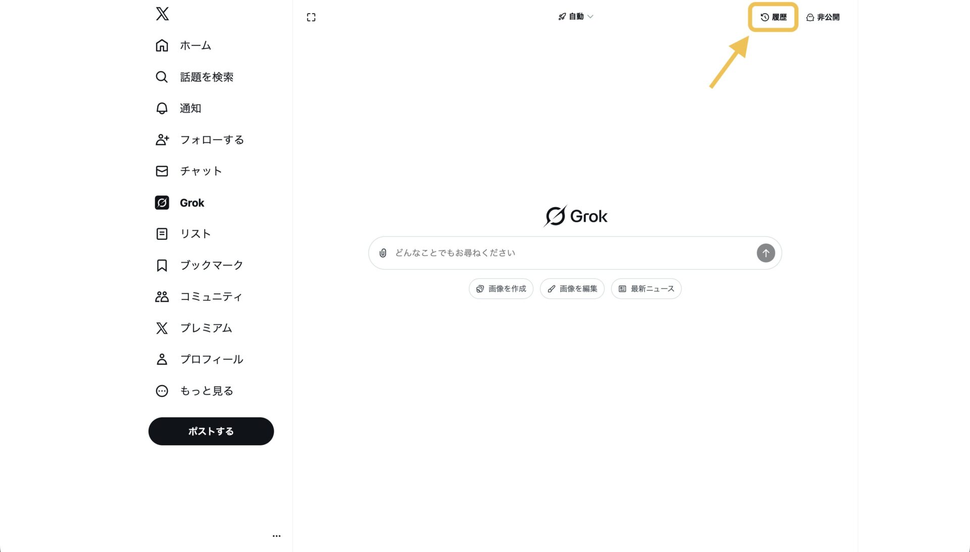 Grokの画面を開くと以下の画面になります。右上「履歴」を選択してください。