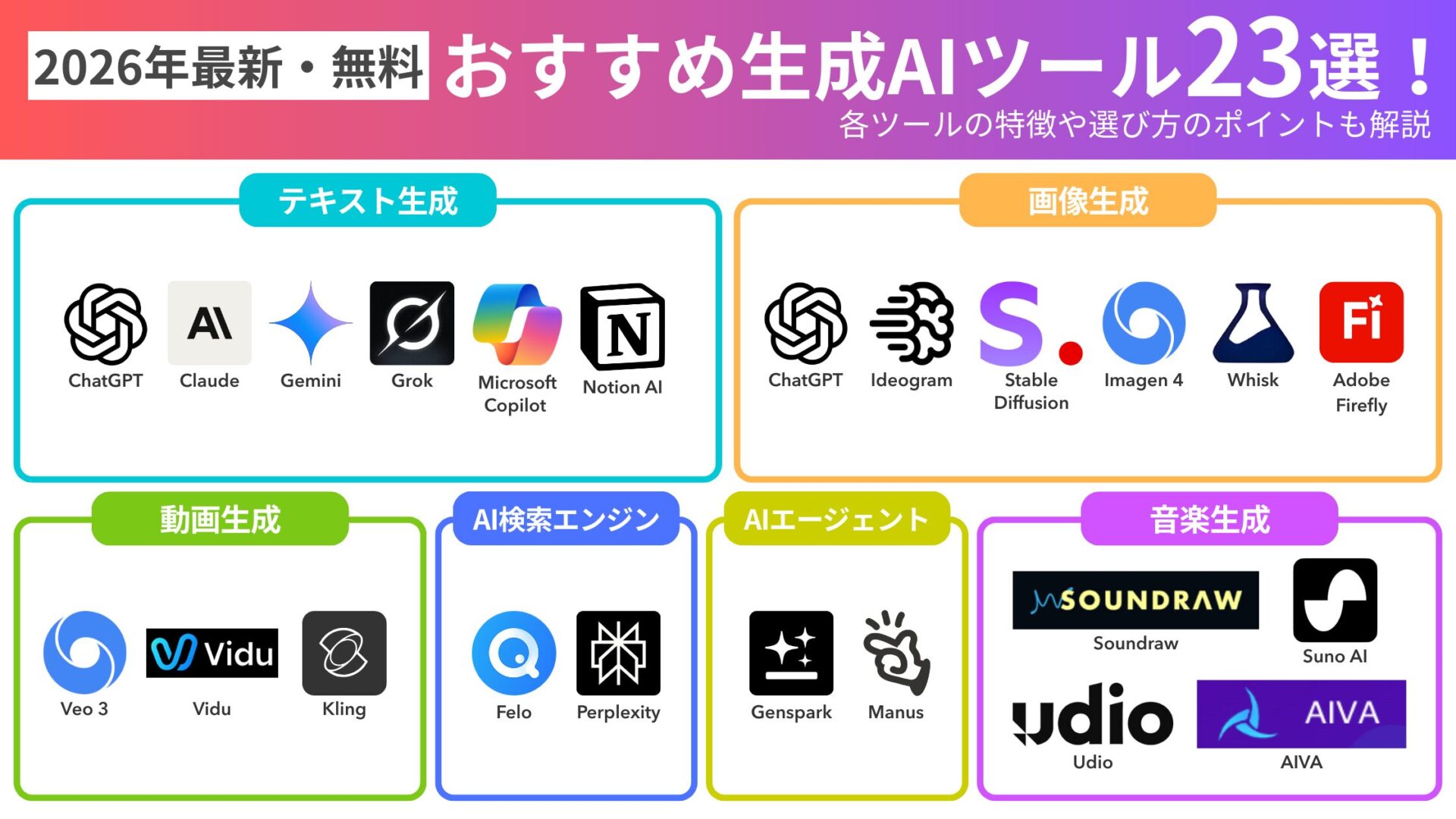 【2026最新・無料】おすすめの生成AIツール23選!各ツールの特徴や選び方のポイントも解説