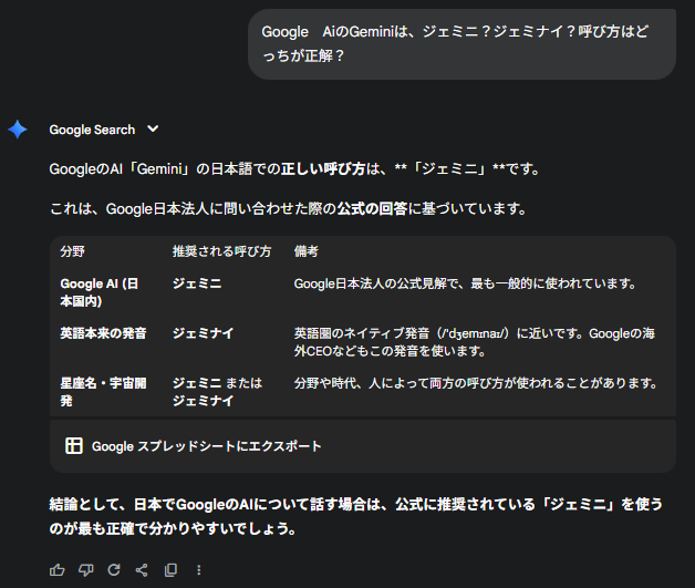 投稿では、Geminiに対して正しい読み方に関する質問を投げかけたところ、「日本語表記は、公式にはジェミニ」という回答がされています。