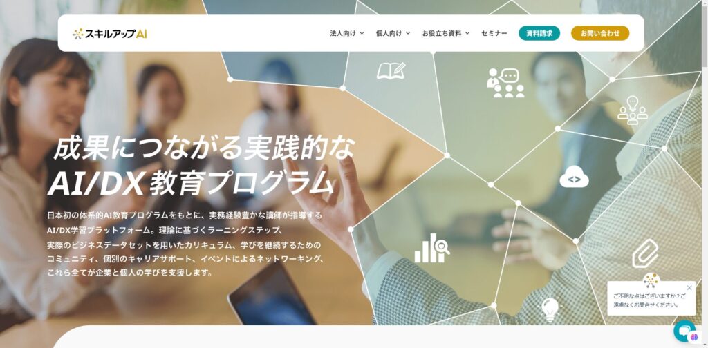 オンライン形式で場所や時間を問わず学べ、社員のデジタルスキル向上やAI活用を目指す企業に最適です。