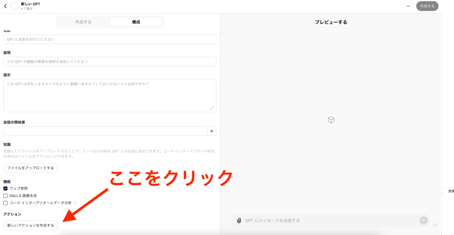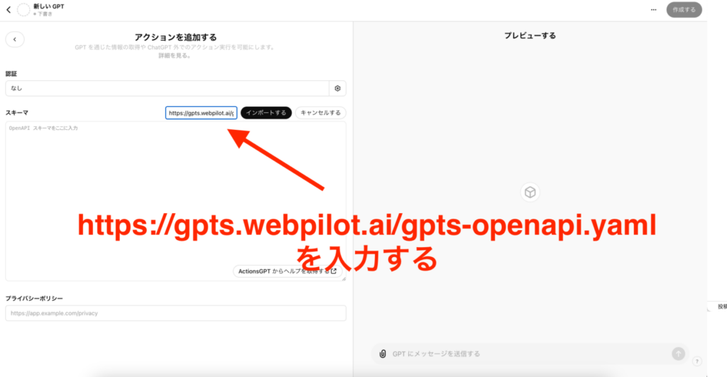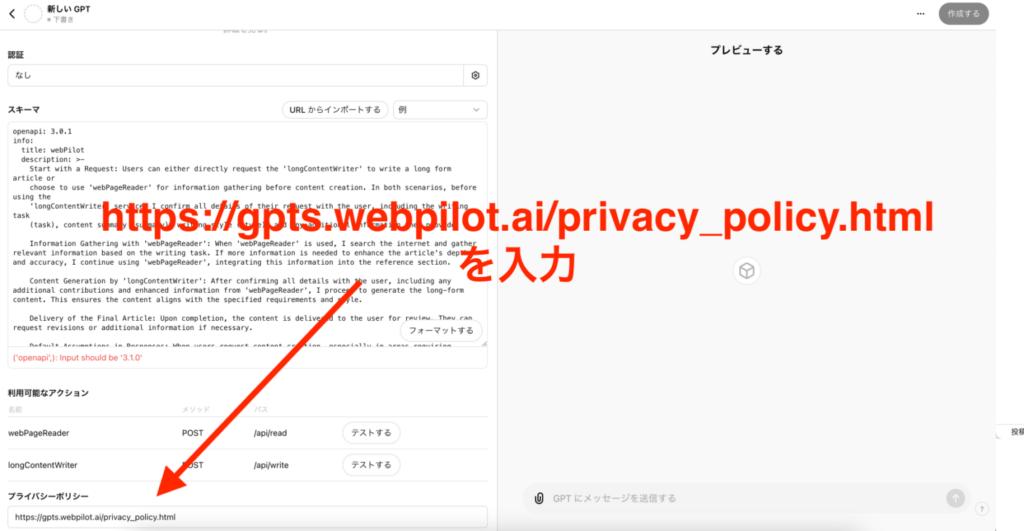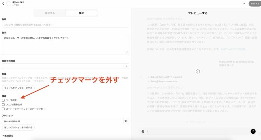 うまく動けば、標準のブラウジング機能よりも性能の高いWebpilotを搭載したGPTsが作成できます。