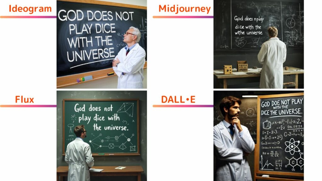 以下に、Ideogram・Midjourney・DALL•E・Fluxでそれぞれ生成した画像を並べます。プロンプトでは「God does not play dice with the universe(神はサイコロを振らない)」を黒板に書くように指示を出しています。