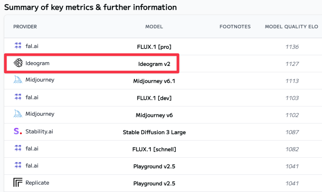 Ideogram 2.0は、画像生成AIの分野で長らくトップの座を守っていたMidjourneyを性能面で凌駕しました。Artificial Analysis Text to Image Model Leaderboardというランキングサイトで、Ideogram 2.0はFluxという画像生成AIに次ぐ2位を獲得し、Midjourneyを抜いたのです。