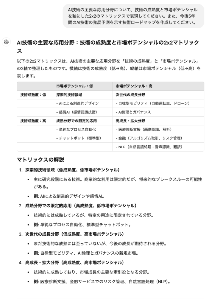 得られたデータをマトリックスや技術ロードマップにまとめるよう、ChatGPTに依頼します。
