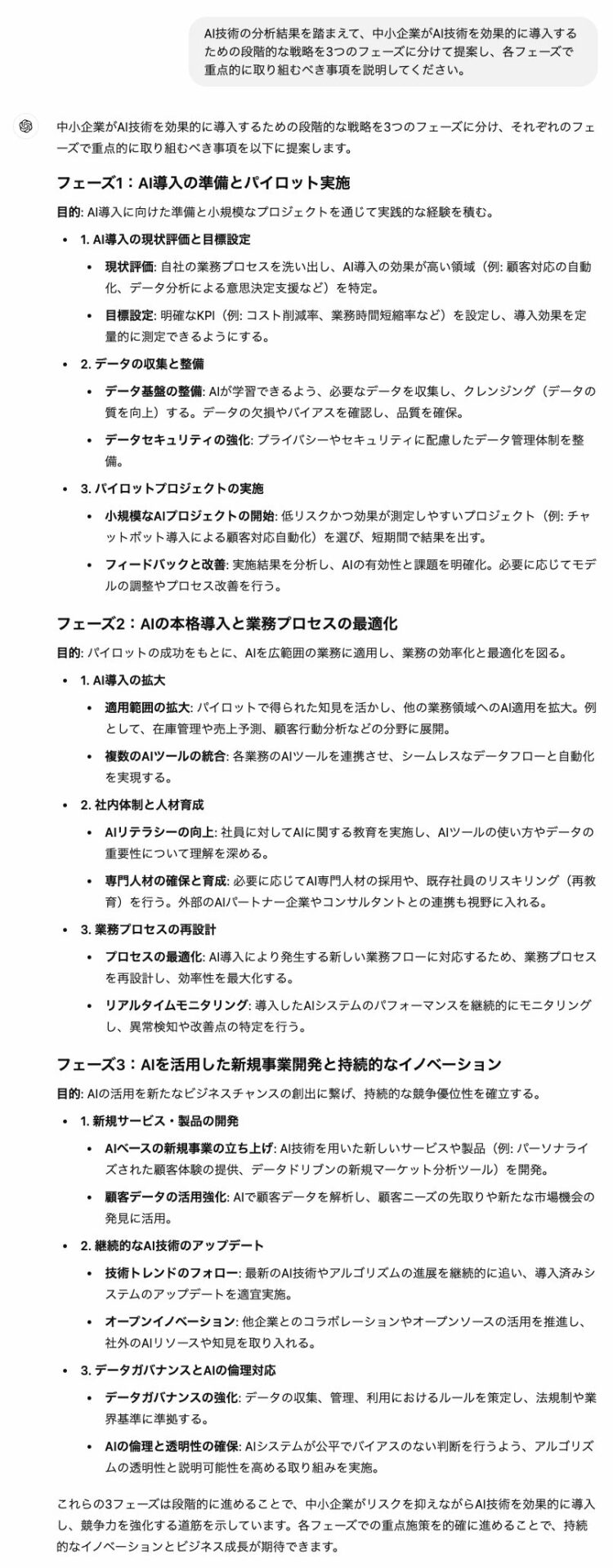 このプロセスにより、ChatGPTを活用して収集した情報を実践的な知識に変換し、ビジネス戦略に直接反映させることが可能になります。