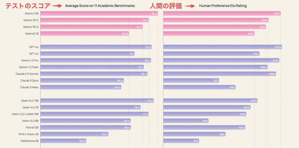 具体的には、11の学術ベンチマークの平均スコアにおいて、Molmo-72Bは81.2点を獲得し、GPT-4oの78.5点を上回っています。また、人間による評価では、Molmo-72BはGPT-4oに次ぐ2位にランクされています。