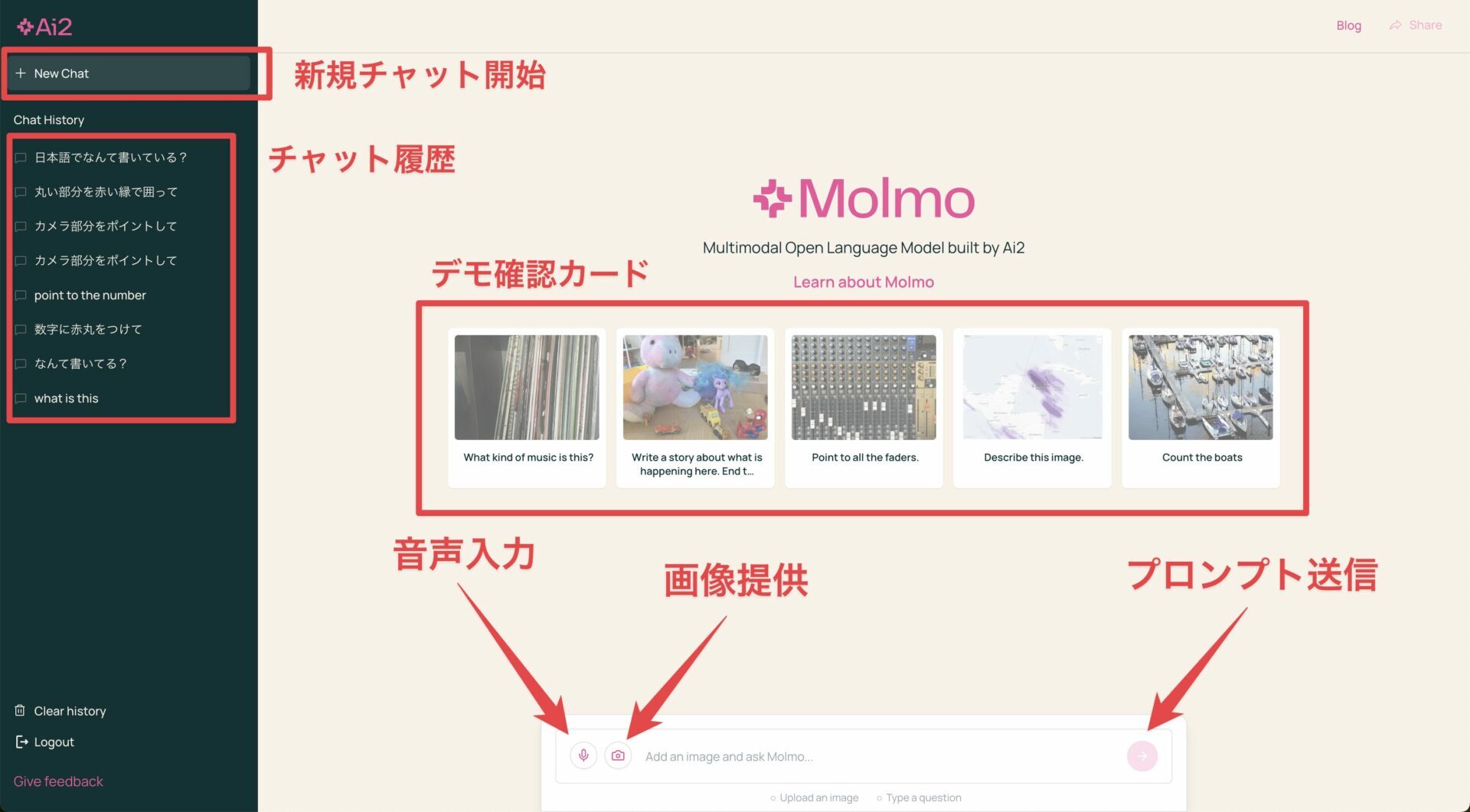 まずは以下の画像で、Molmoの使用画面の説明を確認してみてください。