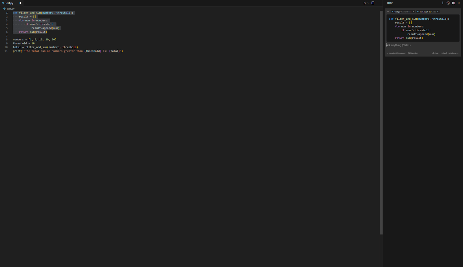 例えば、コードの選択した部分について、ショートカットキー(ctrl+L)ですぐにChat形式でAIモデルに質問することも可能です。