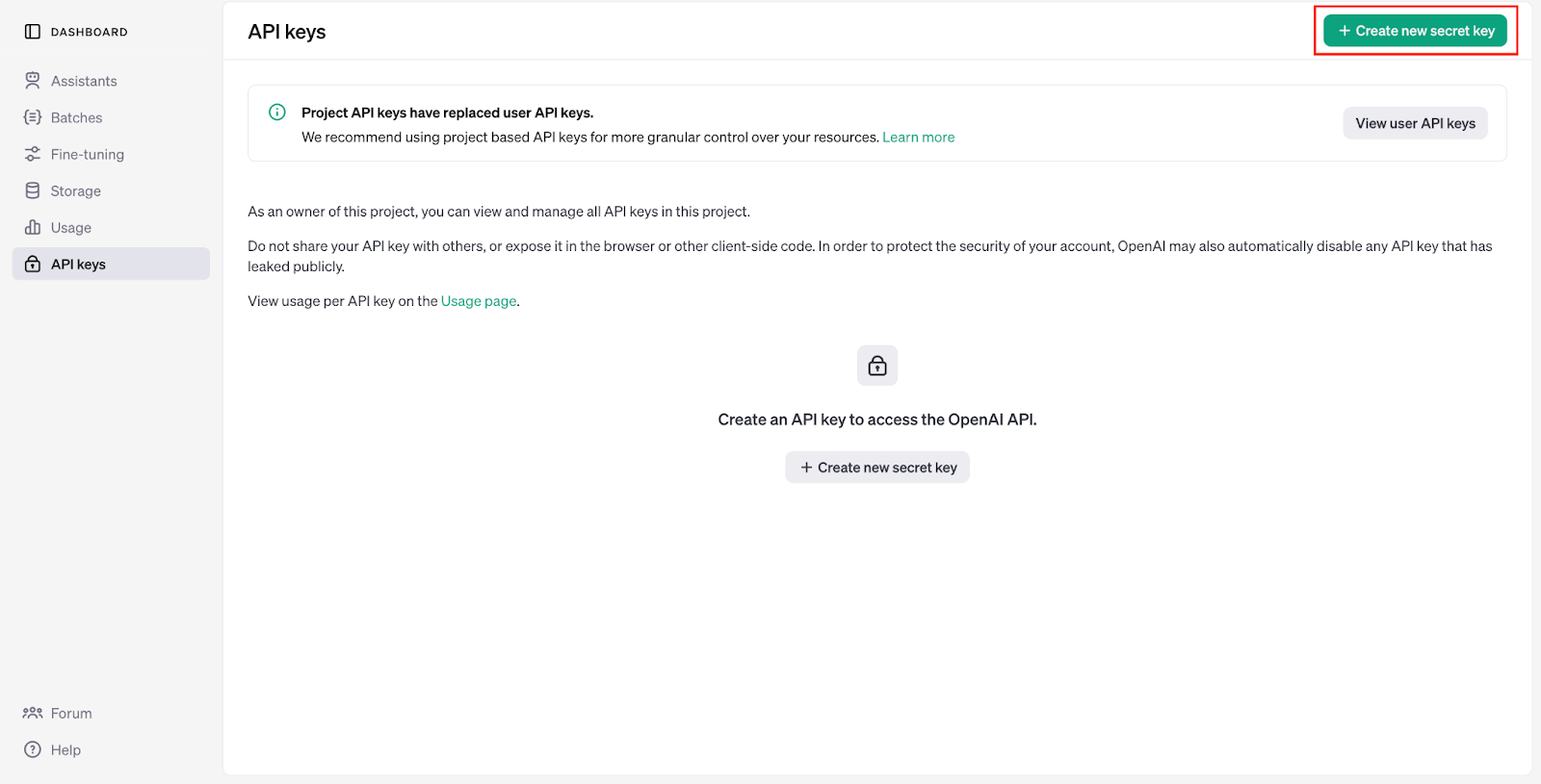 ダッシュボードのメニュー内にある「API Keys」タブを選択し、「Create new secret key」ボタンをクリックします。これにより新しいAPI Keyが生成されます。