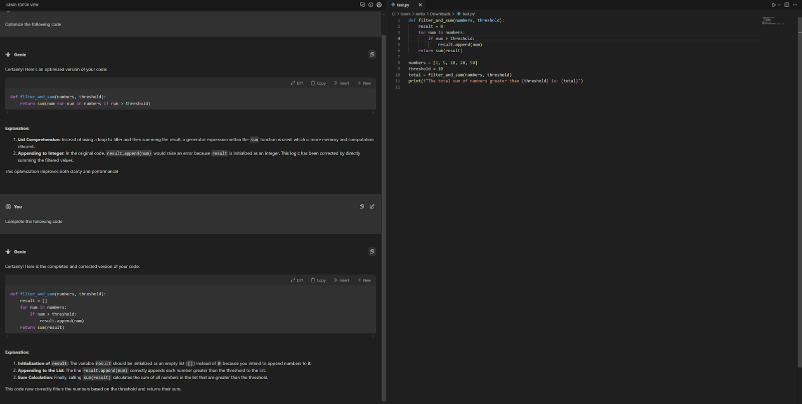 コードの最適化提案を行います。選択したコードに対して「Optimize」を実行すると、ChatGPTが効率的なコードに改善する提案をします。 - Genie: Explain