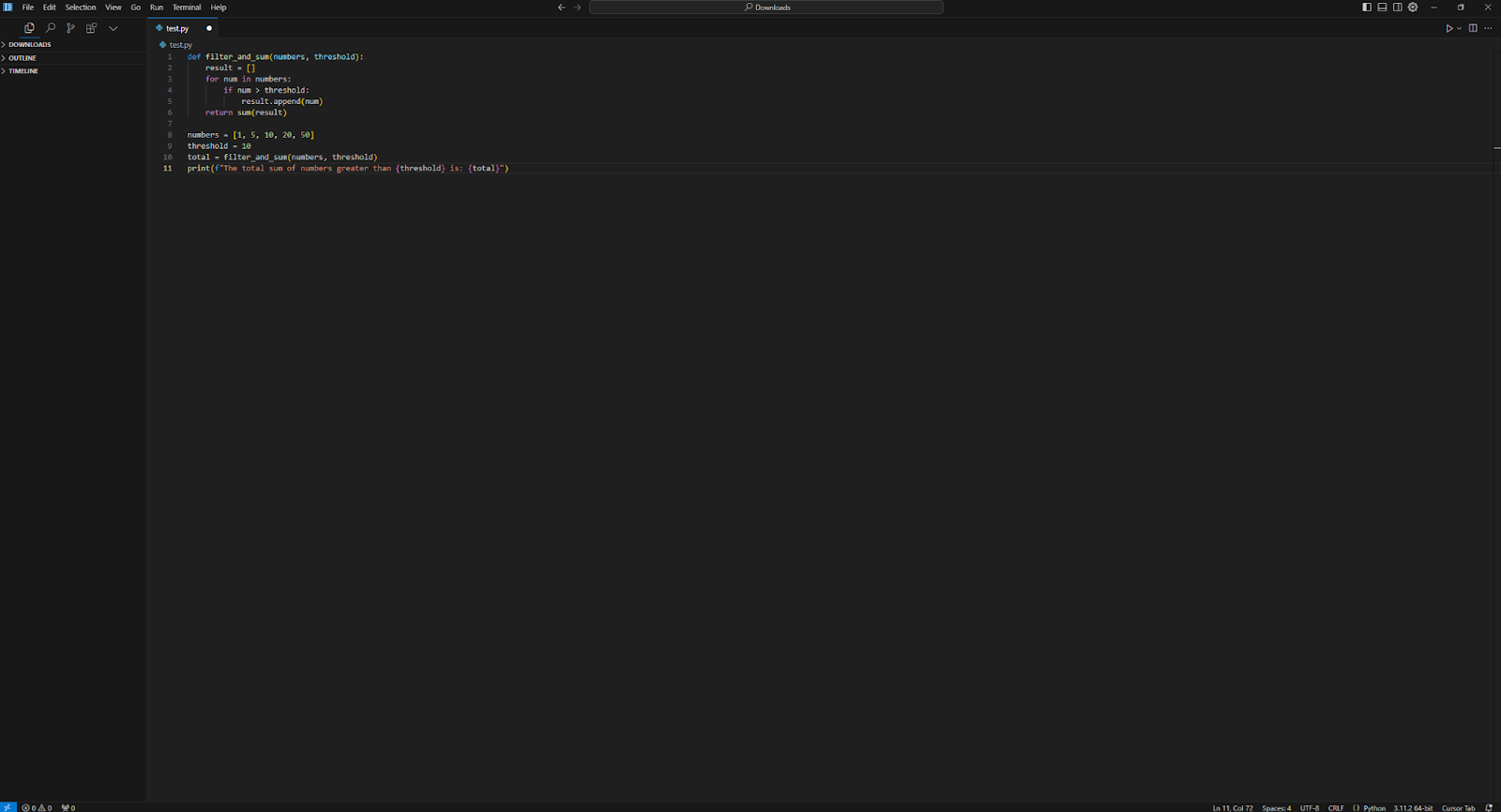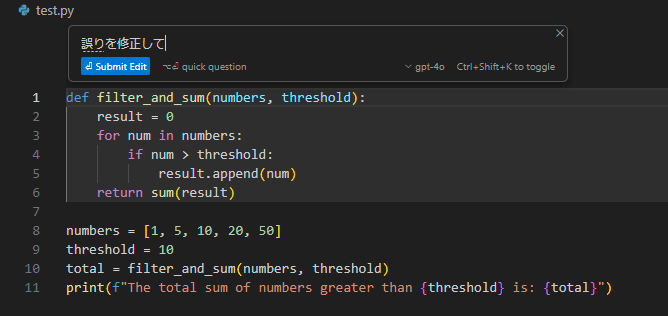 また、修正したい部分を選択してctrl+Kをクリックすることで、AIモデルに自然言語で指示を出してコードを修正できます。