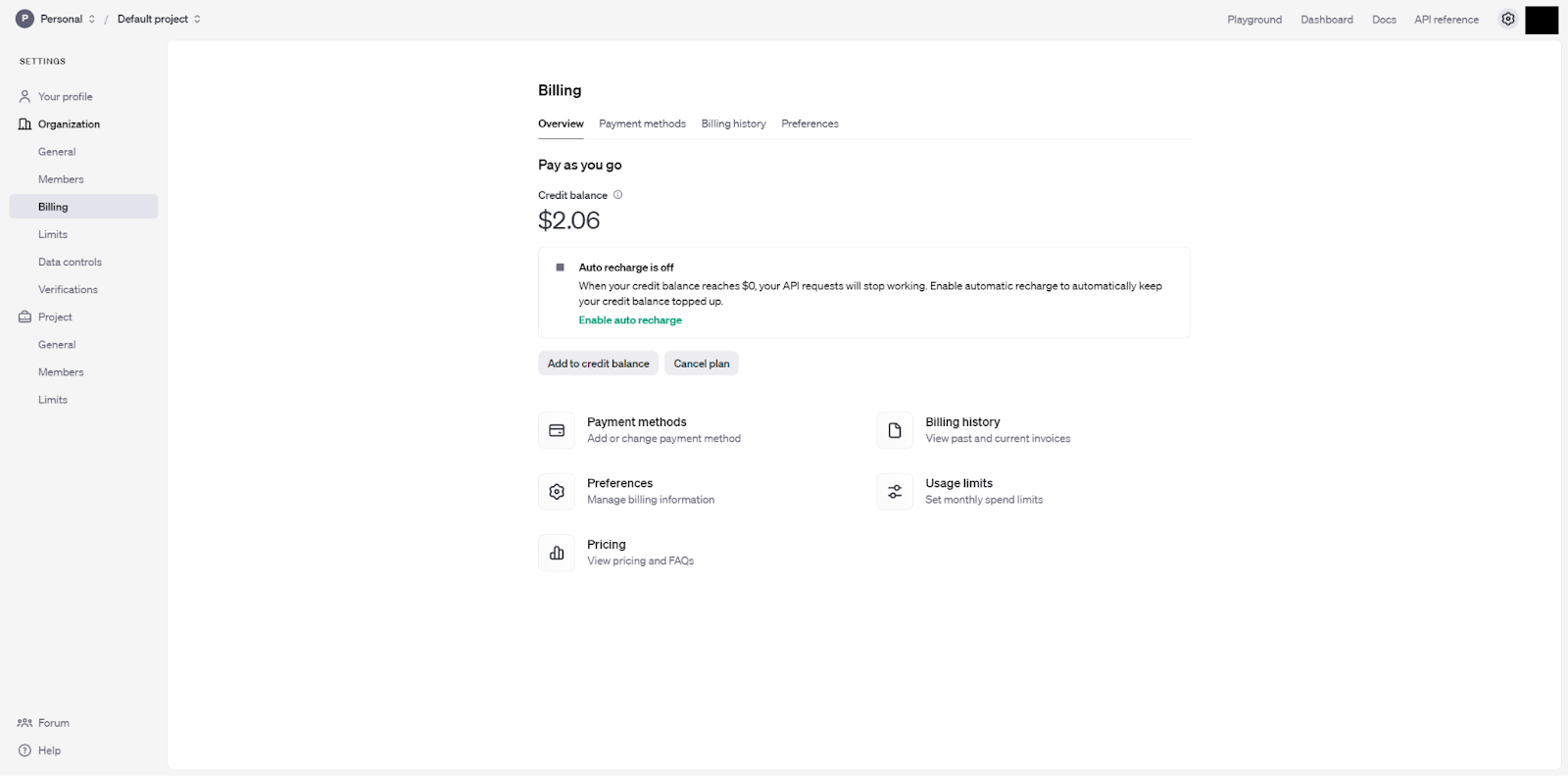 Billingタブで「Add to credit balance」を選択して、クレジットを追加します。