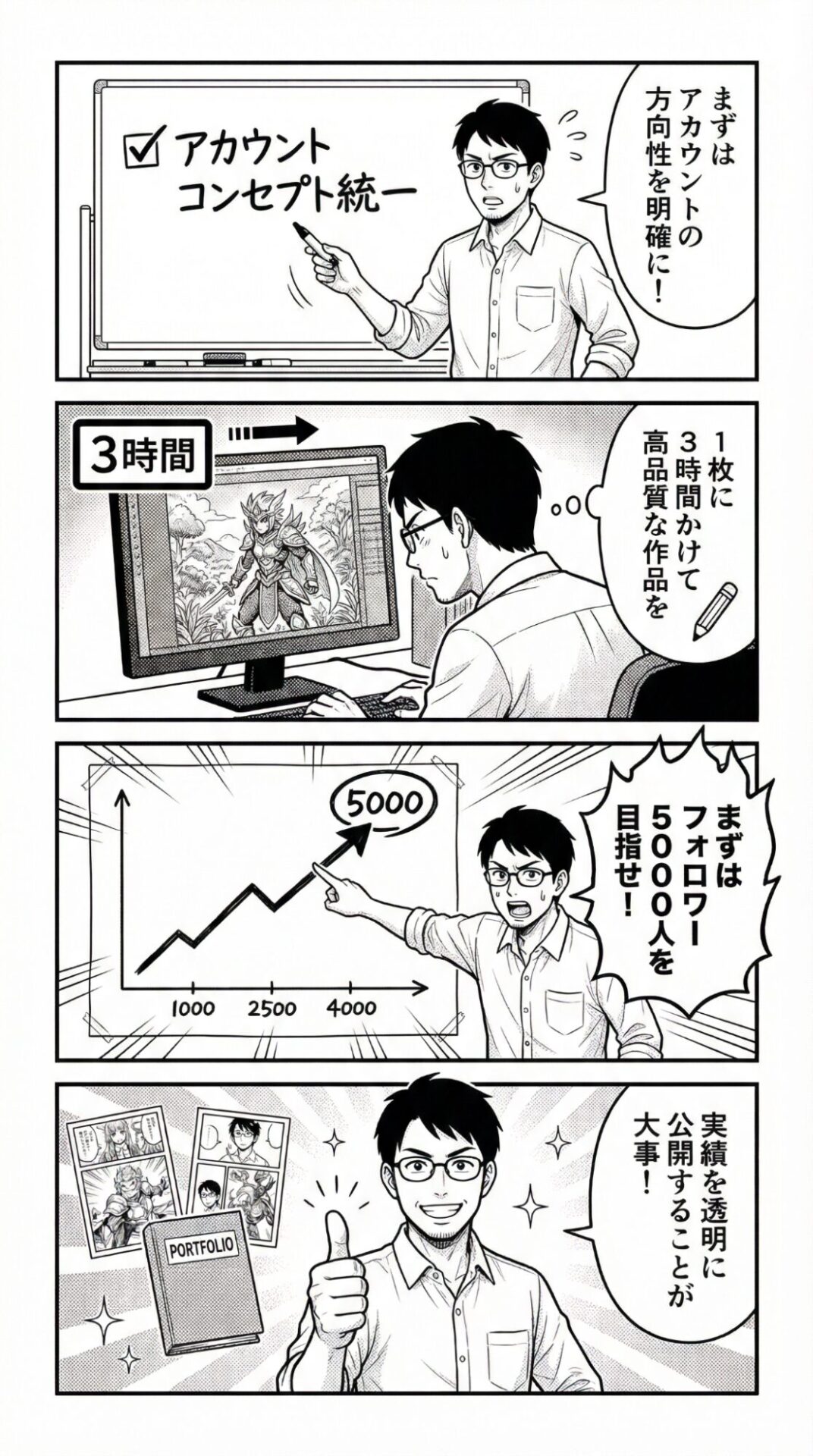 - 1枚に3時間かける姿勢は、技術向上と認知獲得の両面で有効。